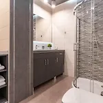 Wrocapartments Starcenter appartement|Wrocapartments Starcenter heeft een balkon en een eethoek, ingericht met een bank, evenals entertainmentfaciliteiten zoals een flatscreen TV met satellietzenders en TV met meerdere kanalen. Deze accommodatie is uitgerust met een badkamer met een droger, toiletartikelen voor gasten en handdoeken. Bovendien is er ook een apart toilet, een badkuip en een douche.